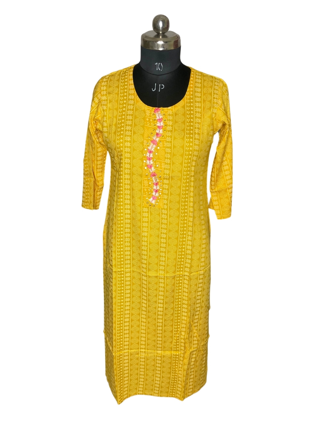 Design: Straight-cut silhouette with floral embroidery on the yoke.