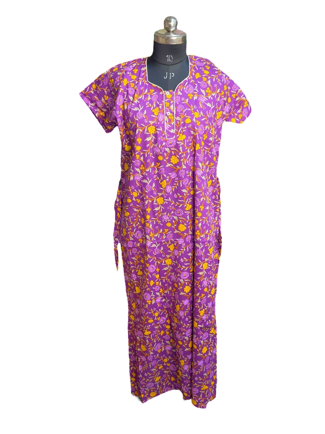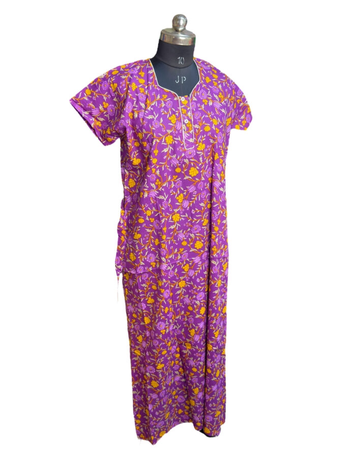 Ladies Cotton Nighty – Comfortable, breathable 100% cotton nightdress with floral print, round neck, short sleeves, and knee-length design. Perfect for nightwear and loungewear.