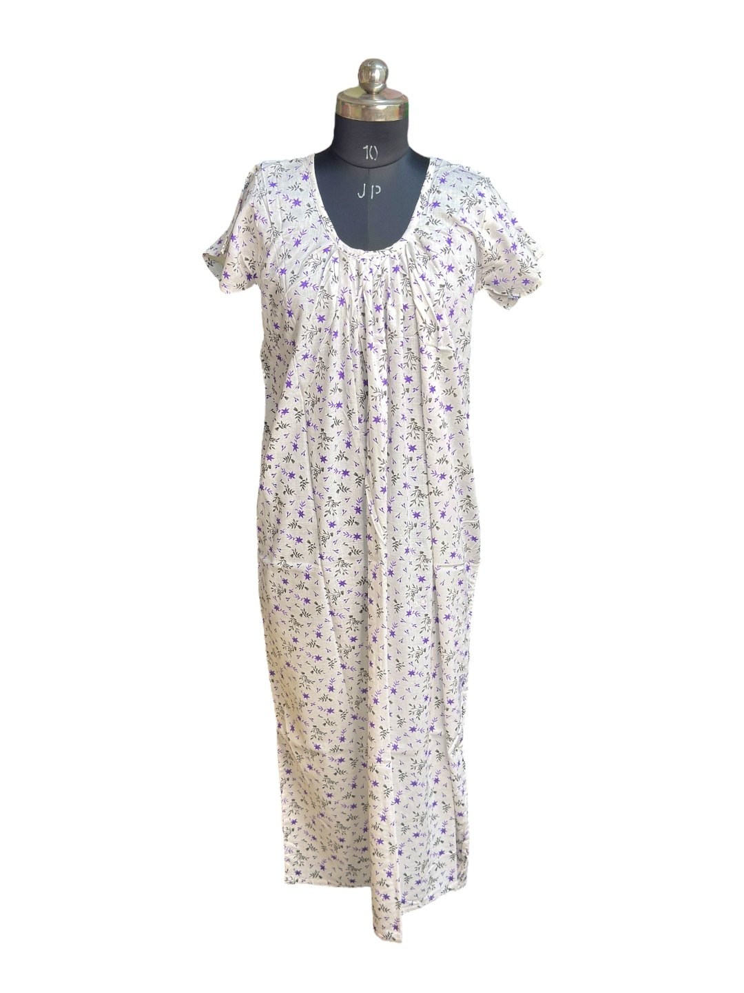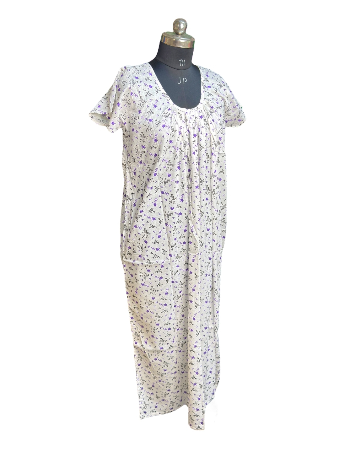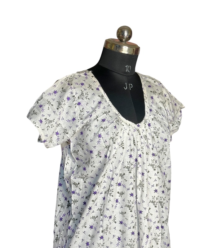 Ladies Cotton Nighty – Comfortable, breathable 100% cotton nightdress with floral print, round neck, short sleeves, and knee-length design. Perfect for nightwear and loungewear.
