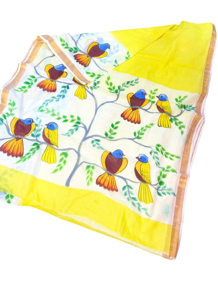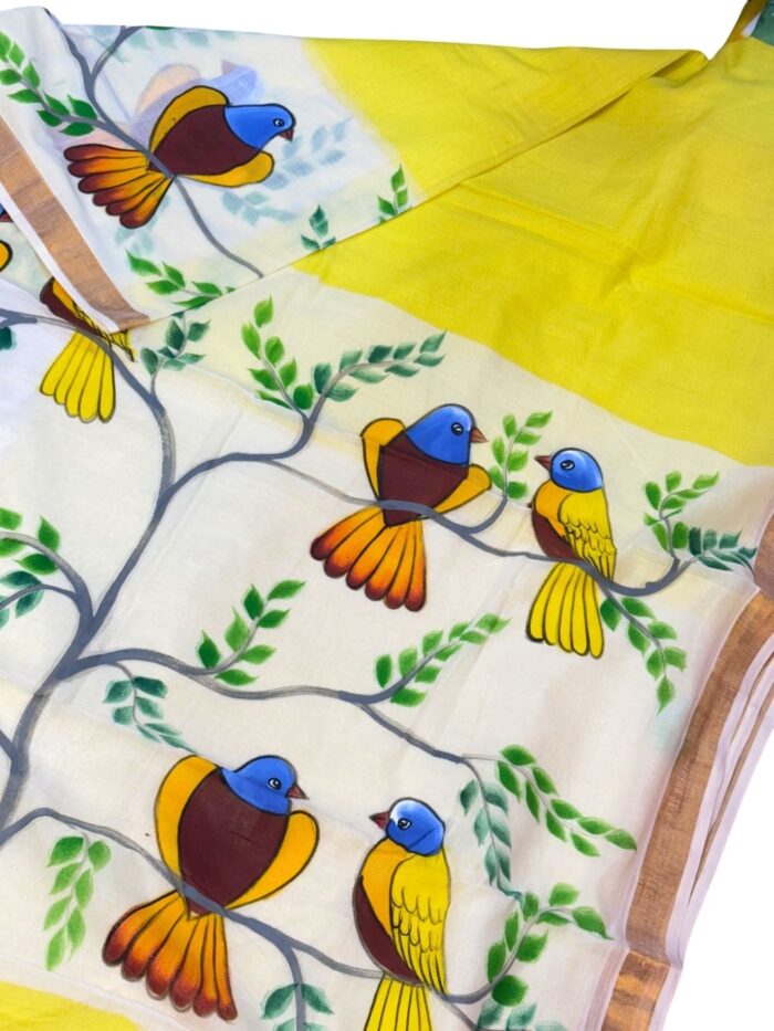 Pure Kerala Cotton Saree with Hand Fabric Work – lightweight, breathable, soft texture, traditional Kerala handloom with unique handcrafted detailing. Perfect for festivals & daily ethnic wear.