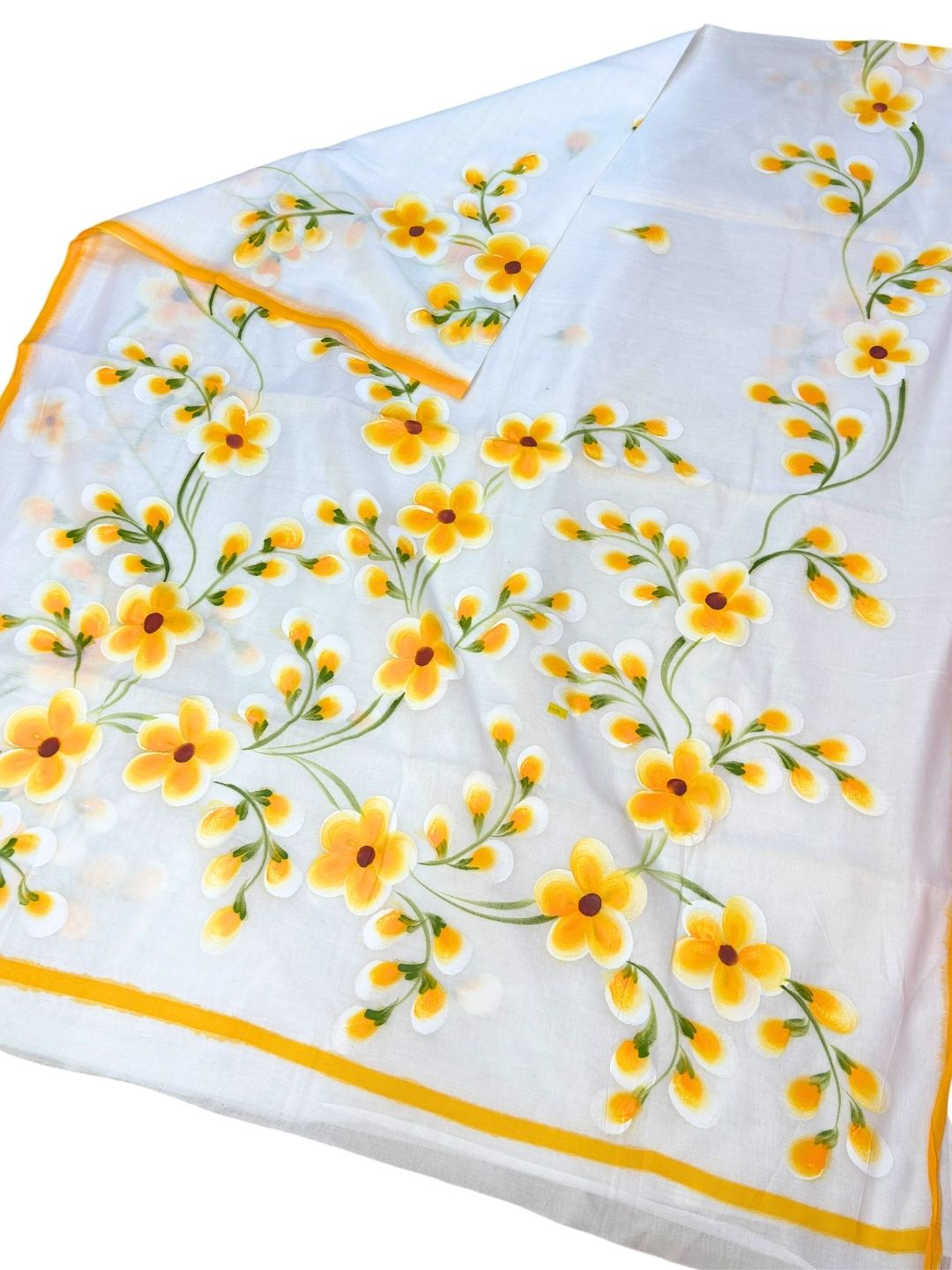 Pure Kerala Cotton Saree with Hand Fabric Work – lightweight, breathable, soft texture, traditional Kerala handloom with unique handcrafted detailing. Perfect for festivals & daily ethnic wear.