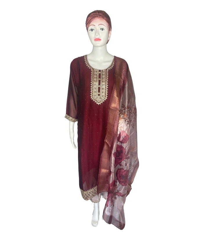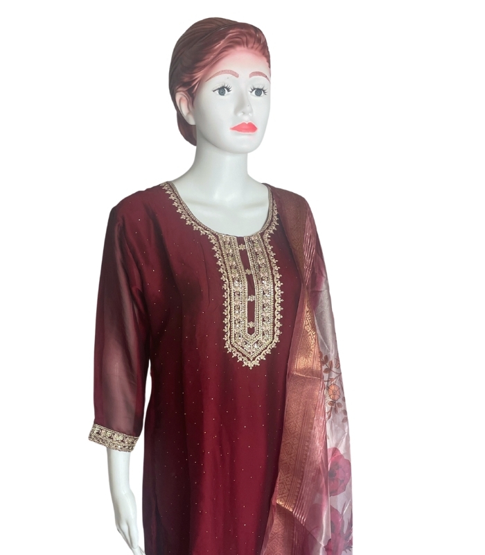 Premium Silk 3-Piece Designer Kurti/Salwar Suit – Elevate your ethnic wardrobe with this luxurious silk suit set, complete with embroidered kurti, matching salwar, and dupatta. Ideal for weddings, festivals, and special occasions. Perfect blend of elegance and comfort.