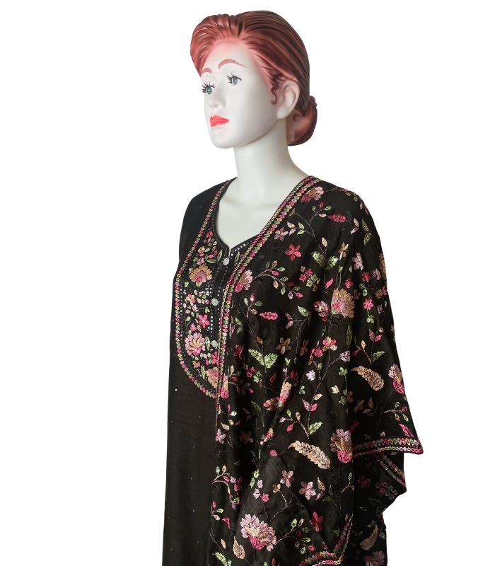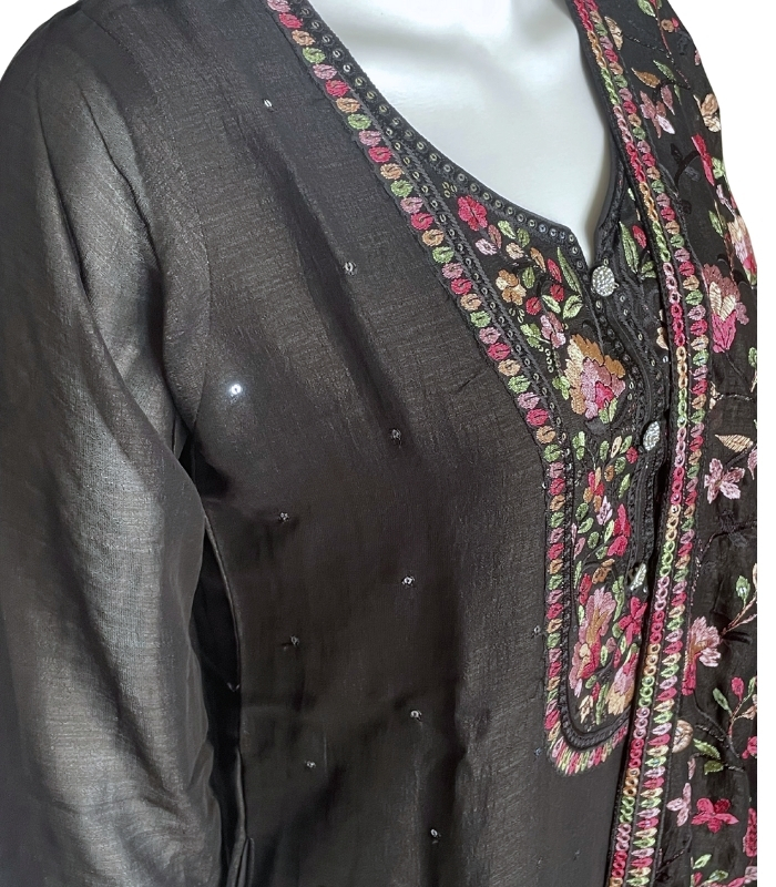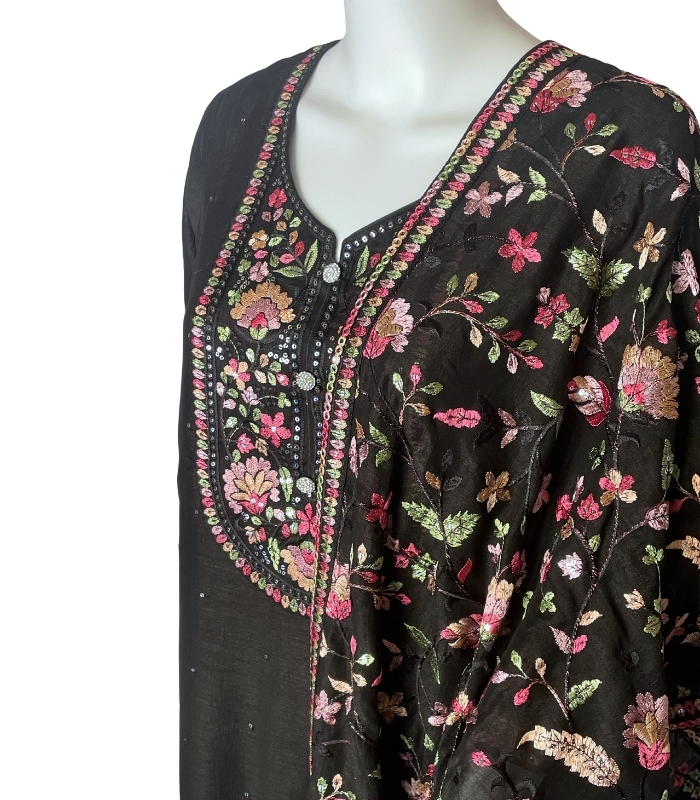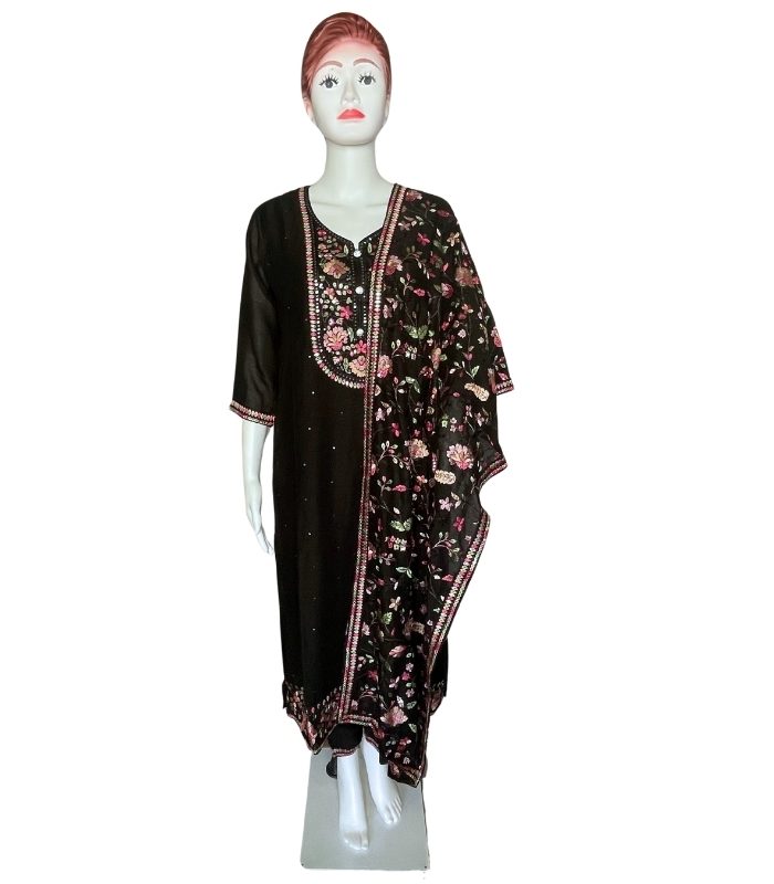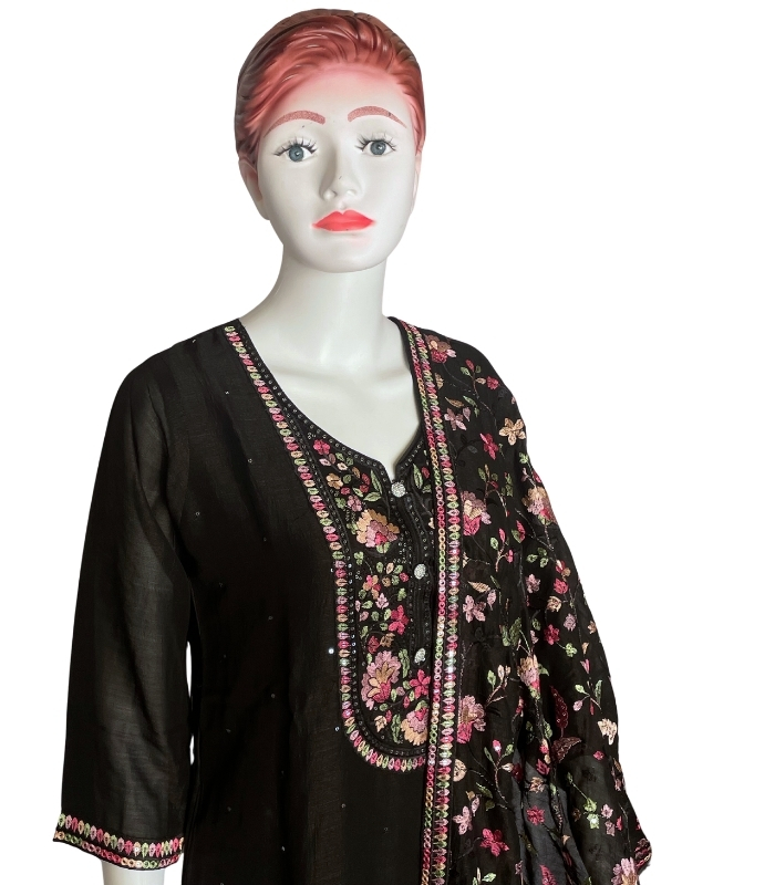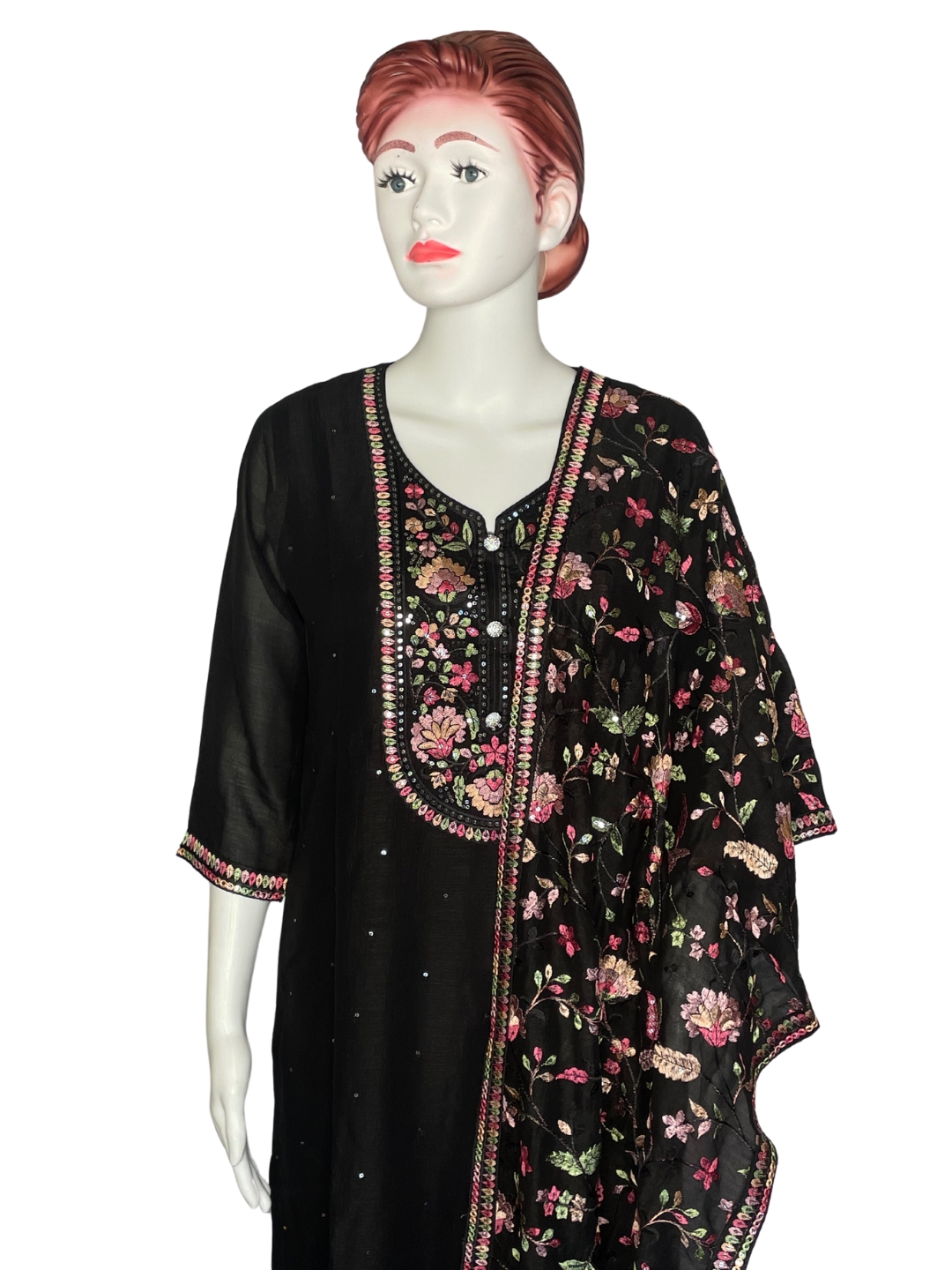 The 3-piece suit offers a perfect fit with its tailored design, suitable for various body types. The silk fabric ensures breathability and comfort, while the elegant black color enhances your silhouette, giving a timeless appeal. Whether you’re dressing up for a family function or a special evening, this black silk kurti set is bound to make you stand out. The detailing on the kurti and dupatta elevates the entire look, adding a designer charm that is both modern and traditional.