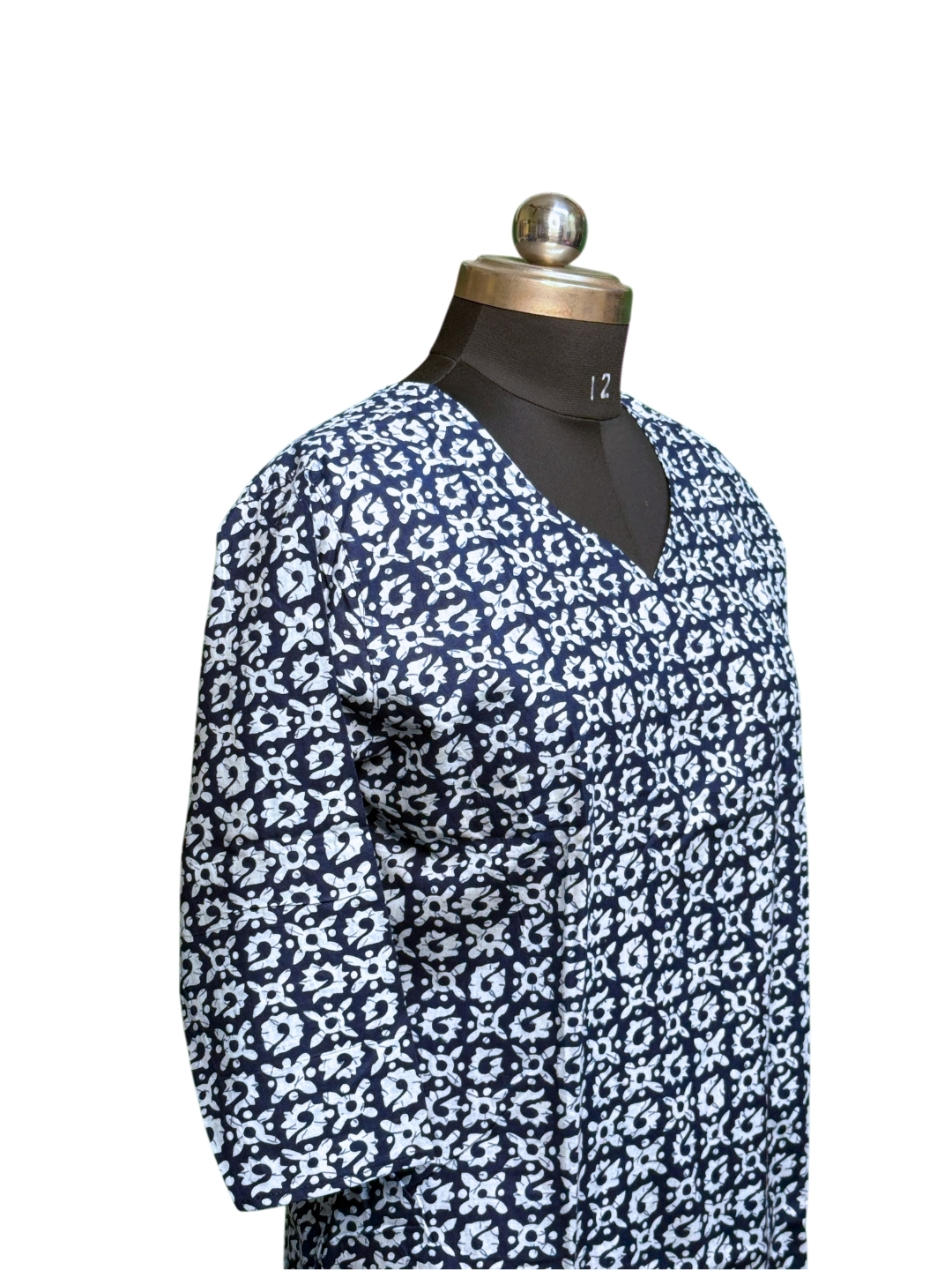 Style: Round neckline, three-quarter sleeves, and side slits.